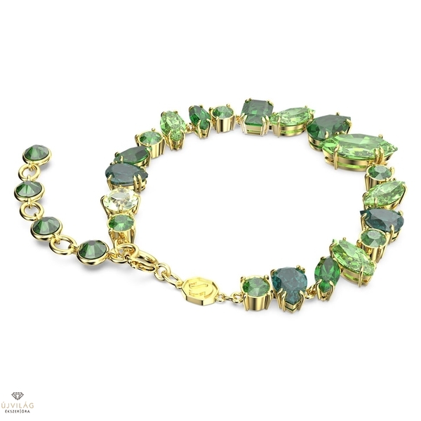 Ez a Gema karkötő mindig meglepő a vibráló csiszolások és színek keverékével. Hipnotikus árnyalatai a mélyzöldtől az élénkzöldig terjednek, mindegyik kő ragyogó aranyozott foglalatba van foglalva. Válassza ezt a darabot, hogy egy kis magával ragadó színt vigyen megjelenésébe. Minimális hossz: 16.5 cm, Maximális hossz: 19.5 cm, Szélesség: 1.3 cm