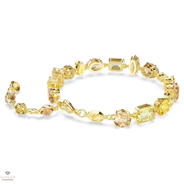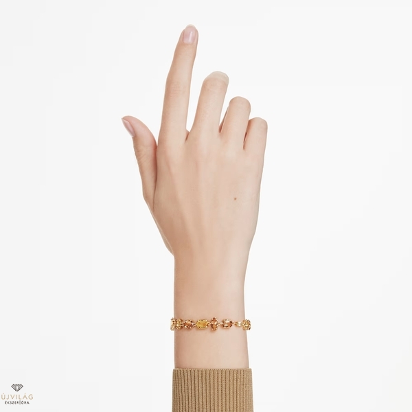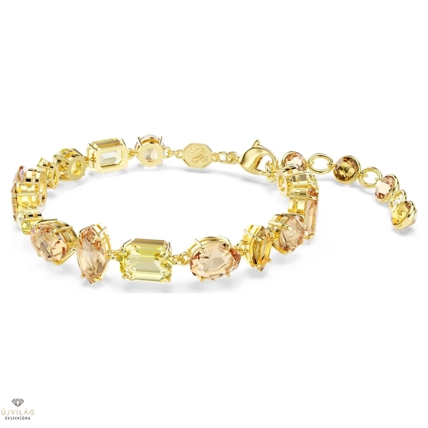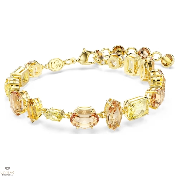 Ez a vibráló, karakteres Gema karkötő gazdag színvilágával és ragyogásával nyűgöz le. Az aranyszínű bevonattal ellátott ékszeren különböző metszésű, sárga és borostyánszínű, prong foglalatú kristályok pompáznak, a díszített hosszabbító pedig lehetővé teszi a méret egyszerű beállítását. Ez a karkötő a Gema váratlan formáinak és élénk szépségének jelképe, és még ragyogóbb lesz, ha az ékszercsalád többi, hozzáillő ékszereivel együtt viseli. Méretek: Hossz (minimum - maximum): 15.5 - 19 cm. Szélesség: 1 cm
