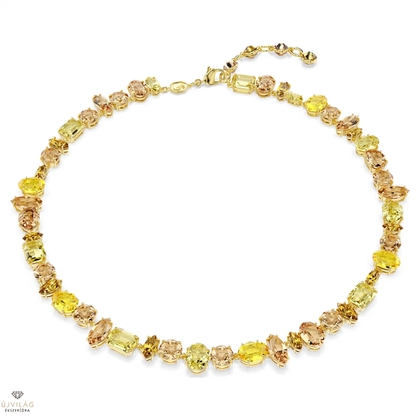 Emelje új szintre megjelenését ezzel a ragyogó, aranyszínű bevonattal ellátott nyaklánccal. A mindennapokra és a különleges alkalmakra egyaránt tökéletes, teljes felületén díszített nyakláncot prong foglalatú kristályok ékesítik, drámai metszési formák és sárga, valamint borostyán árnyalatok keverékében. Ez a nyaklánc a Gema váratlan formáinak és élénk szépségének jelképe, és még ragyogóbbá válik, ha az ékszercsaládba tartozó, hozzáillő ékszerekkel viseli. Méretek: Hossz (minimum - maximum): 36 - 40.5 cm. Szélesség: 1 cm