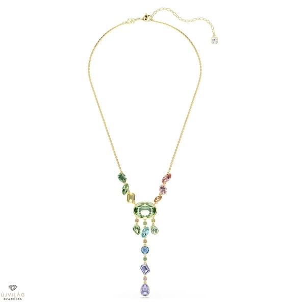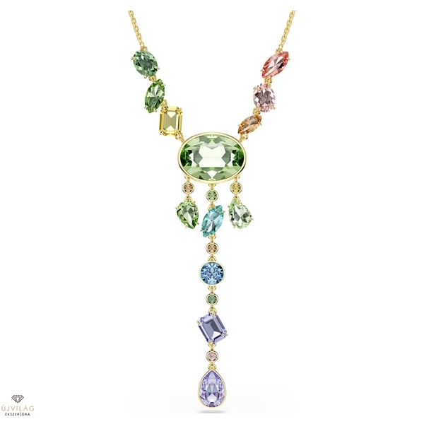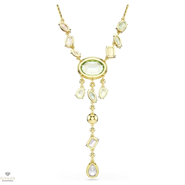 A telített színek kavalkádjával életre keltett, arany tónusú bevonattal ellátott nyaklánccal garantáltan mindenkit lenyűgözhet. Az Y-alakú nyaklánc közepén egy zöld ovális kristály látható, amelyet különböző formájú, méretű és árnyalatú kristályok vesznek körül. A Swarovski Recreated™ kristályok tovább fokozzák az igazi vidámság érzetét. Hossz (minimum - maximum): 42 - 49 cm. Szélesség: 1.5 cm. Y minta hossza: 6.5 cm.