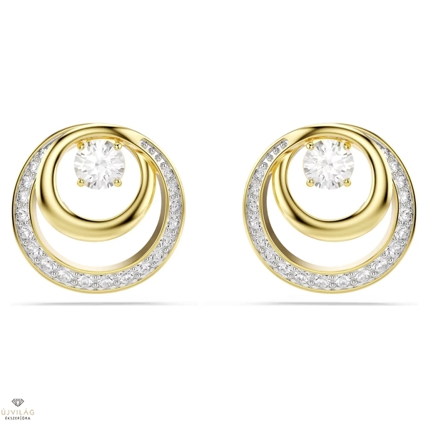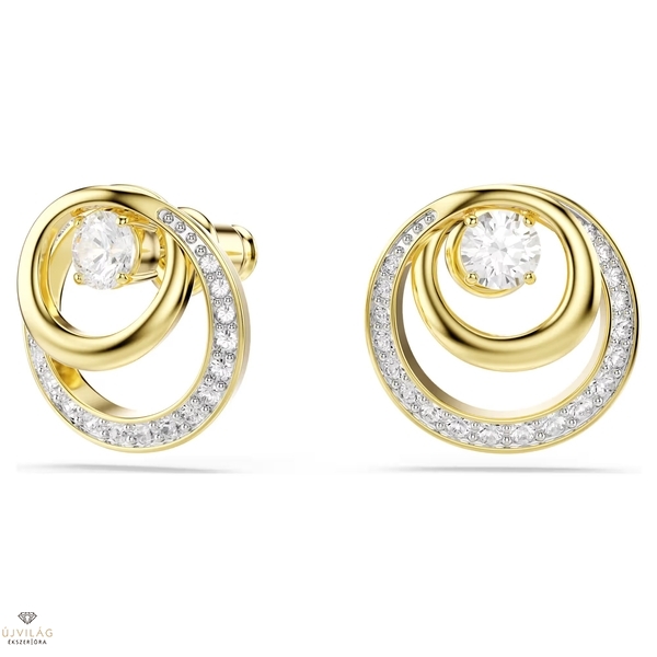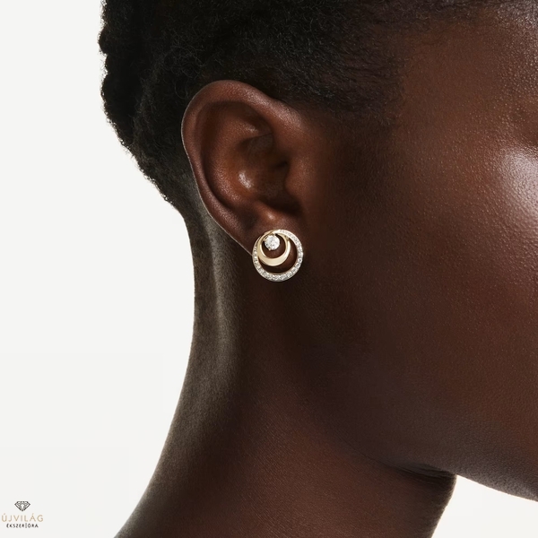 Szeressen bele a körkörös stílusú kialakításba ezzel az arany tónusú bevonattal ellátott Hyperbola fülbevalóval. Minden egyes hipnotikus darab közepén egy Swarovski Zirconia kristály található, amelyet fémes spirálok és csillogó pavékristályok vesznek körül. Viselje hozzáillő nyaklánccal vagy gyűrűvel a modern kifinomultság hangsúlyozásához. Méret: 1.5 x 1.5 cm.