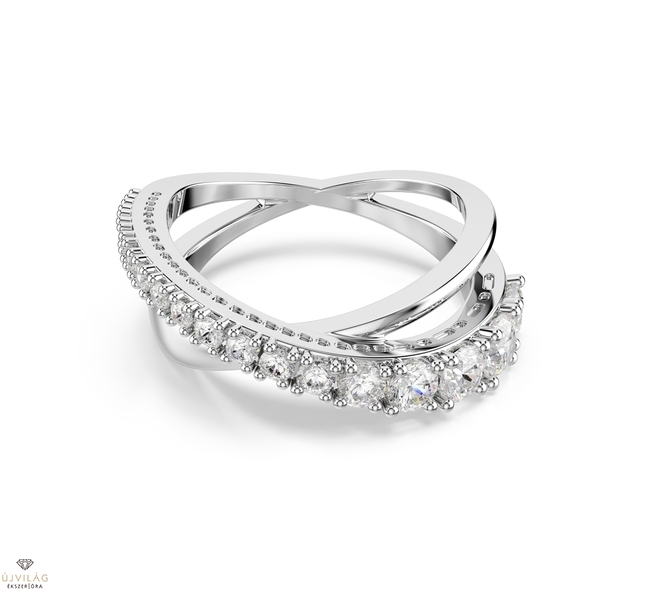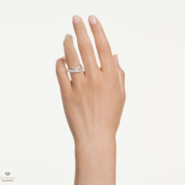 Ez a Swarovski gyűrű egyedi darab, és a spirálos trend ihlette. Két csillogó pánt fonódik össze elegáns ívekben, az egyik növekvő méretű, átlátszó kristályokból álló pavédíszítést kapott, a másik pedig letisztult fémes formában pompázik. Ez a gyűrű egy csipetnyi ragyogással dob fel bármely megjelenést, így ragyogó választás a mindennapokra.