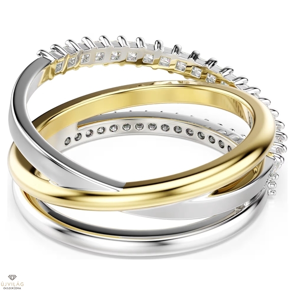 A csavart Hyperbola gyűrű többféle stílust egyesít egyetlen gyönyörű, összetett ékszerben. A három vegyes, arany árnyalatú és ezüstszínű bevonattal ellátott karikából álló gyűrűt prong foglalatba helyezett kerek és négyszögletes metszésű Swarovski Zirconia kristályok díszítik. Tökéletes választás az egyedi stílusszabályokat alkotóknak.