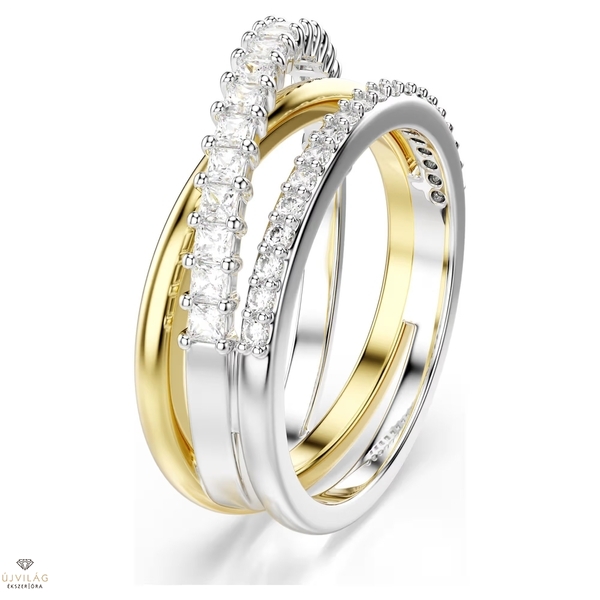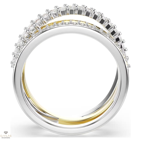 A csavart Hyperbola gyűrű többféle stílust egyesít egyetlen gyönyörű, összetett ékszerben. A három vegyes, arany árnyalatú és ezüstszínű bevonattal ellátott karikából álló gyűrűt prong foglalatba helyezett kerek és négyszögletes metszésű Swarovski Zirconia kristályok díszítik. Tökéletes választás az egyedi stílusszabályokat alkotóknak.