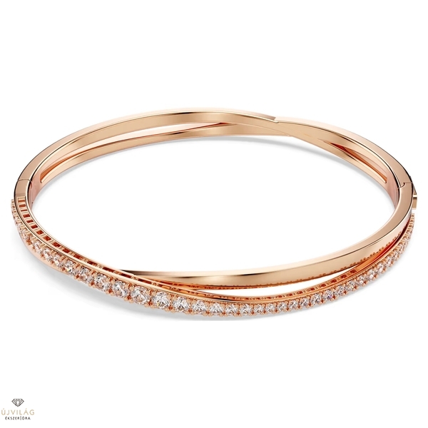A stílusos és diszkrét, rozéarany bevonatú karperec leheletfinom és időtlen eleganciája különlegessé tesz minden hétköznapi öltözéket. A klasszikus luxus modern értelmezése, ugyanis a kanyargós csiszolt fémszál egy másik, ragyogó fehér kövekkel díszített ív köré fonódik. Kedves ajándék. Méret (ovális): 5.8 cm x 5.2 cm