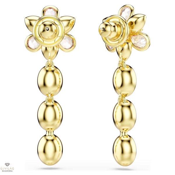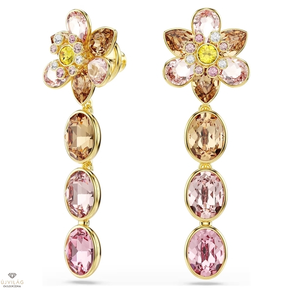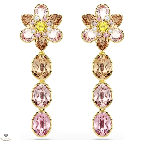 Ez a karakteres megjelenést biztosító, aranyszínű bevonattal ellátott fülbevaló a színek és a fény szimfóniája. Mindegyik darab egy-egy virágot ábrázol, amelyek különféle metszésű és színű kristályokból készültek, három, bezel foglalatú, hozzájuk illő lágy árnyalatú kristállyal együtt. Ez a természet ihlette fülbevalópár ideális mindennapi viseletre, és gyönyörűen illik az Idyllia család más darabjaihoz. Méret: 4.7 x 1.5 cm