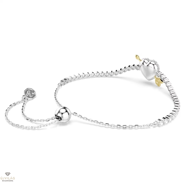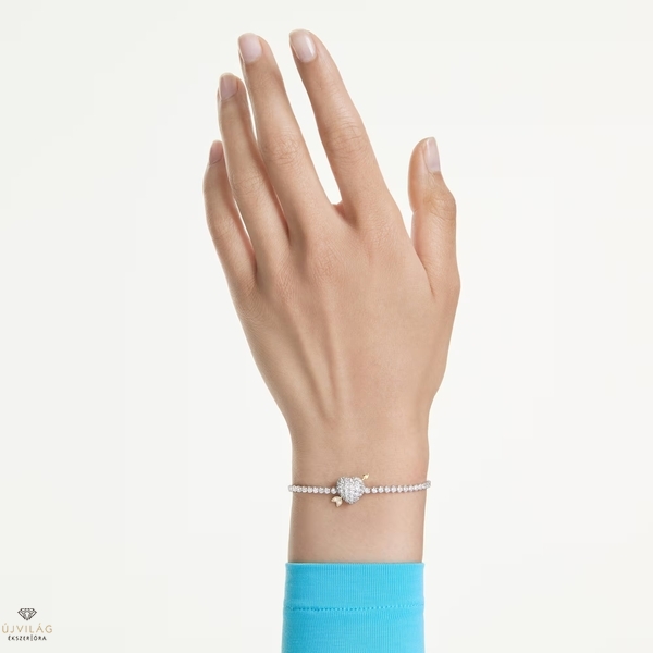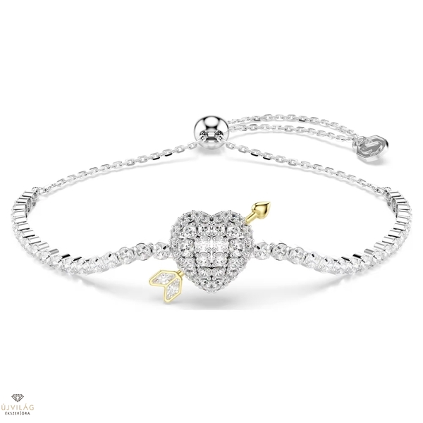 Az igaz szerelem és a ragyogó fény találkozik ebben az Idyllia családba tartozó Swarovski karkötőben. A finom láncot körmetszéses kristályok díszítik ródiumbevonatú foglalatban, míg középen egy csillogó szív motívum látható, Ámor arany tónusú nyilával átszúrva. A csúsztatható zárral a csuklójára igazíthatja a méretet, és a karkötőt a romantikus ihletésű kollekció más hozzáillő ékszereivel is viselheti. Maximális hossz: 24 cm. Minta mérete: 1.2 x 1.4 cm.