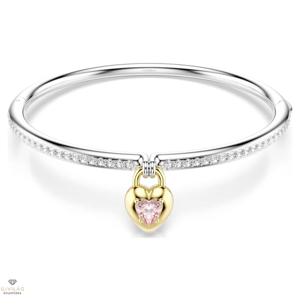 A romantika luxust sugárzó megnyilvánulása ez a karcsú karperec, amelyet átlátszó kristályok borítanak, középen pedig egy lakat ihlette szív díszíti. A romantikus motívum egyik oldalán egy Pink Swarovski Zirconia kristály pompázik arany tónusú bevonattal, a másik oldalán pedig átlátszó kristálypavé díszítés található ródiumbevonattal. Viselje a hozzáillő gyűrűvel a szerelem ihlette megjelenés kihangsúlyozásáért. Hossz: 18.3 cm. Belső átmérő: 6.2 x 5.4 cm. Minta mérete: 1.4 x 1 cm. Nyitott rész szélessége: 4.2 cm.