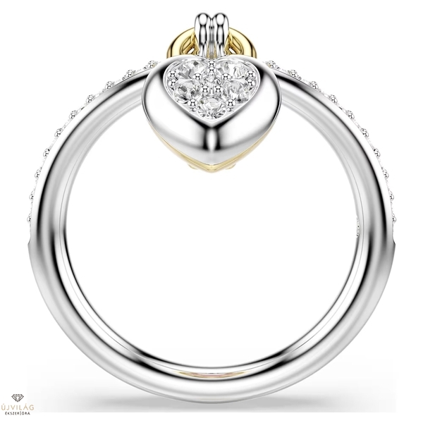 Ezt az odaadást szimbolizáló karcsú gyűrűt átlátszó kristályok borítják, középen pedig egy lakat ihlette szív díszíti. A romantikus motívum egyik oldalán egy Pink, szív alakú Swarovski Zirconia kristály pompázik arany tónusú bevonattal, a másik oldalán pedig átlátszó kristálypavé díszítés található ródiumbevonattal. Viselje a hozzáillő karpereccel a szerelem ihlette megjelenés kihangsúlyozásáért.