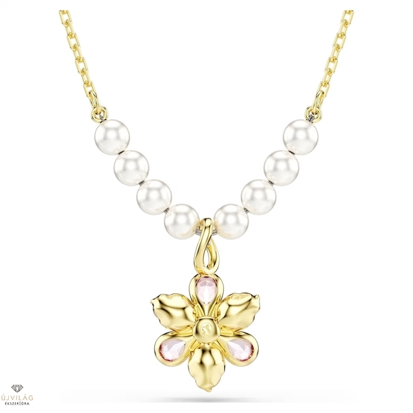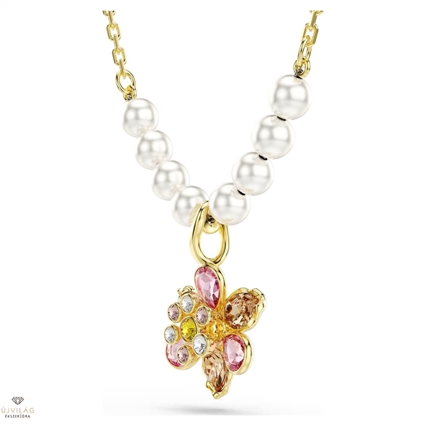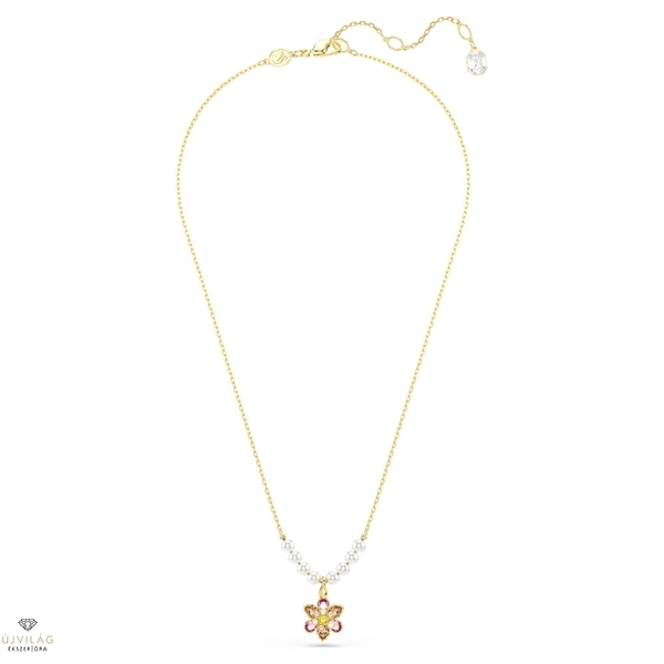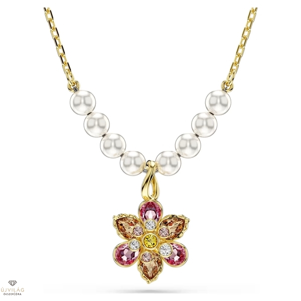 Ez a bájos medál varázslatos, természetközeli hangulatot kölcsönöz bármely öltözéknek. Az aranyszínű bevonattal ellátott láncon nyolc Swarvoski kristálygyöngyöt találunk, elegánsan, egy különféle metszésű és lágy színekben pompázó kristályokból álló virág két oldalán. Az ékszer karabinerkapoccsal és hosszabbítóval van ellátva az állítható méret érdekében. Csodás, fényűző ajándék a könnyed eleganciát sugárzó mindennapi megjelenéshez. Méretek: Hossz (minimum - maximum): 38 - 45 cm. Minta mérete: 1.9 x 1.8 cm