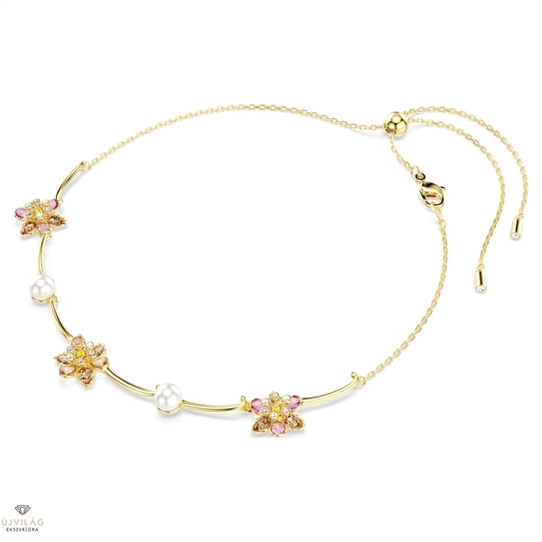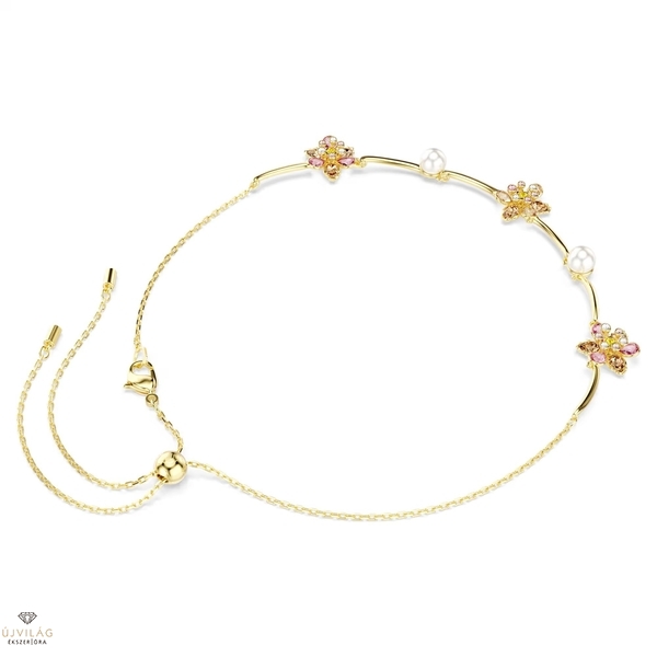 A természet és a luxus ötvöződik ebben a finom, mégis lenyűgöző Idyllia nyakláncban. Az állítható láncra fűzött, teljes hosszában díszített nyaklánc aranyszínű bevonattal ellátott rudakkal rendelkezik, amelyek között Swarovski-kristálygyöngyök és három virág található, amelyek mindegyike különböző metszésű és lágy színű kristályokból készült. Csipetnyi vidám elegancia, amely tökéletesen párosítható a hozzá illő karkötővel, brossal vagy fülbevalóval. Méretek: Hossz (minimum - maximum): 30 - 44 cm. Minta mérete: 1.3 x 3.8 cm