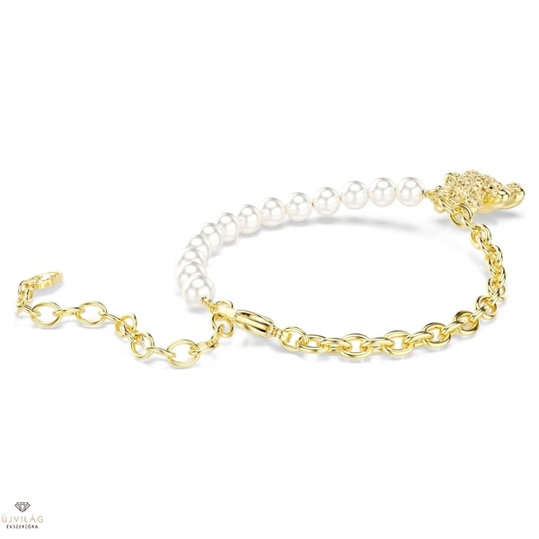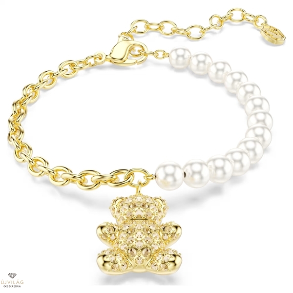 Ez a ragyogó mackós karkötő a gyermekkori kedvenc plüssállatot luxust sugárzó modern köntösbe öltözteti. A szívmelengető mackó motívumot Golden Shadow kristályok díszítik, és egy Swarovski kristálygyöngyökből, valamint arany tónusú bevonattal ellátott láncból álló karkötőn viselhető. Játékos módja a vidámságot sugárzó stílus összeállításának. Hossz (minimum - maximum): 15.5 - 20 cm. Minta mérete: 1.6 x 1.4 cm.