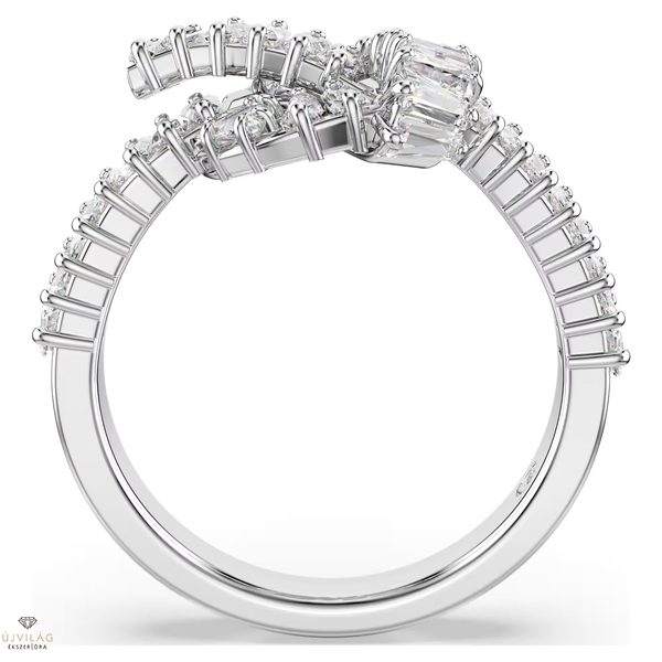 Adjon stílusának fényt vonzó csavart ezzel az elegáns Matrix gyűrűvel. A szalagszerű csomóra emlékeztető, ródiumbevonatú ékszert baguette metszésű Swarovski Zirconia kristályok kifinomult díszítése teszi teljessé, amelyek mindegyike prong foglalatban kapott helyet. Ez a modern és művészi gyűrű tökéletesen illik az ékszercsalád többi darabjához.