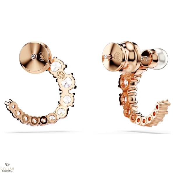 Ez a bedugós fülbevaló minden egyes részletéből szépséget sugároz. A rózsaarany árnyalatú bevonattal készült ékszert nyitott gyűrű alakban átlátszó Swarovski Zirconia kristályok díszítik kisebb és nagyobb változatban, a tetejét pedig egy fehér Swarovski kristálygyöngy zárja le. A hozzáillő Matrix medállal párosítva a feltűnő hatás garantált. Méret: 1.4 x 1.3 cm.