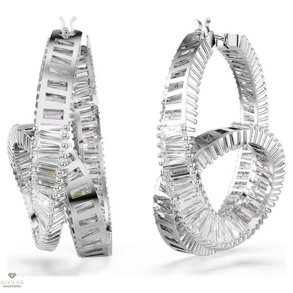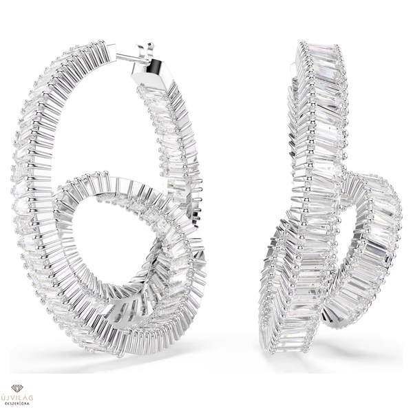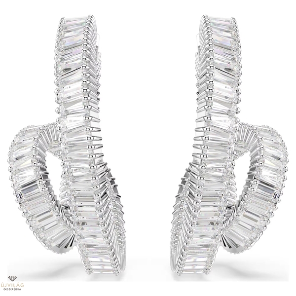 Egyedi, csavart kialakításuknak köszönhetően ezek a bedugós Matrix fülbevalók minden irányba fényt árasztanak. A ródiumbevonatú darabok mindegyike egy szalag formáját idézi, és baguette metszésű, prong foglalatú Swarovski Zirconia kristályok örvényét vonultatja fel. Ez a merész karika fülbevaló extravagáns stílust kölcsönöz, és tökéletes választás a hozzáillő Matrix medállal együtt viselve. Méret: 3.7 x 0.9 x 3 cm
