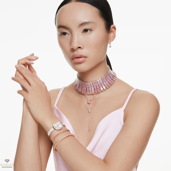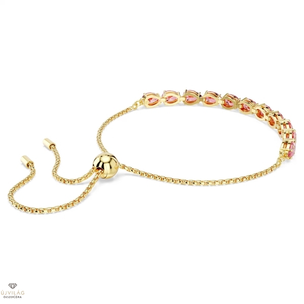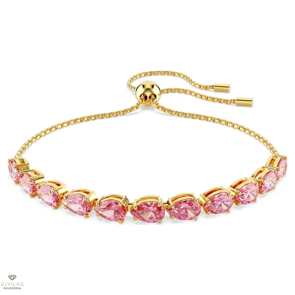 A Swarovski kreativitása sugárzik ebből a vidám és játékos karkötőből. Az aranytónusú bevonattal készült, csúszózáras ékszert romantikus rózsaszín, körte metszésű Swarovski Zirconia kristályok sora díszíti, melyek mindegyike prong foglalatban helyezkedik el. Más karkötőkkel rétegezve tökéletes az egyedi stílus kifejezésére. Maximális hossz: 24 cm. Szélesség: 0.4 cm.