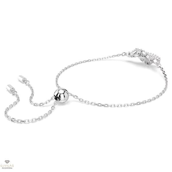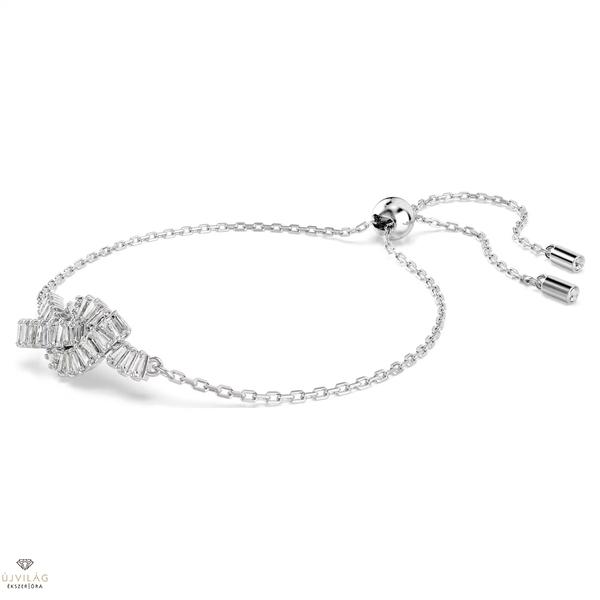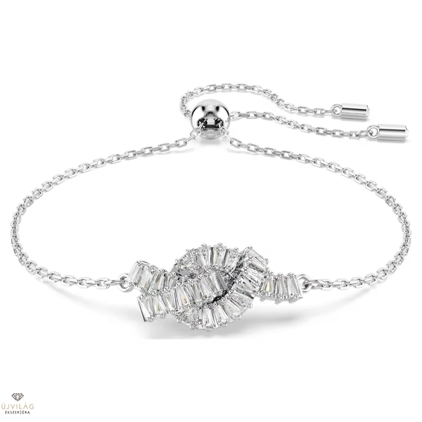 Ez a szövött karkötő a fény és az egység tiszta kifejeződése. A ródiumbevonatú, állítható csúszózáras lánccal készült motívumot egy szalag ihlette, és baguette metszésű Swarovski Zirconia kristályokból álló, megkötött díszítést jelenít meg. Finom és elegáns, művészi választás a hozzáillő, azonos ékszercsaládba tartozó darabokkal együtt viselve. Méretek: Maximális hossz: 24 cm. Minta mérete: 1 x 2 cm