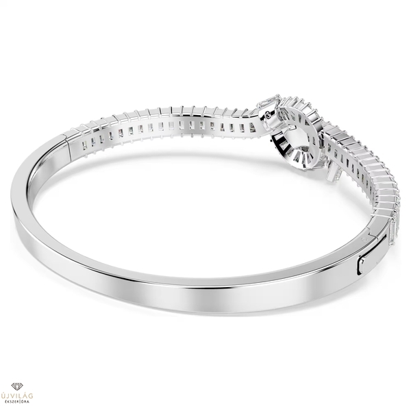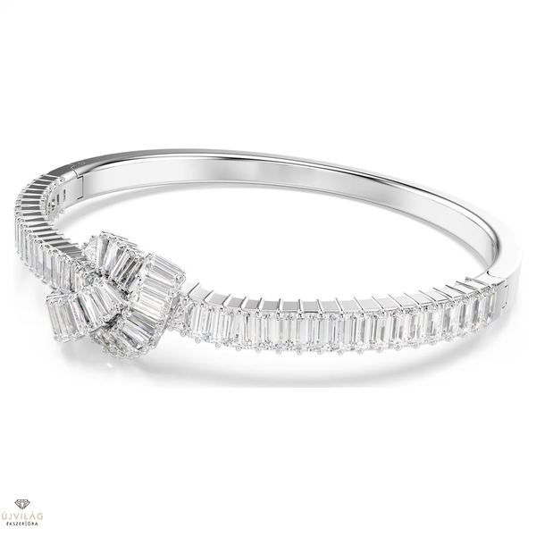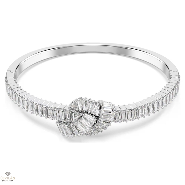 Ez a Swarovski karperec ügyesen össze van kötve egy drámai fénycsomóvá. A szalag ihlette, ródiumbevonatú formavilágot baguette metszésű Swarovski Zirconia kristályok kifinomult díszítése teszi teljessé, amelyek mindegyike prong foglalatban helyezkedik el. Ez a művészi karperec ragyogóan karakteres megjelenést kölcsönöz a csuklónak, és más hozzáillő ékszerekkel párosítva összehangolt megjelenést hozhat létre. Méretek: Hossz: 18.3 cm. Belső átmérő: 6.2 x 5.4 cm. Minta mérete: 1.4 x 1.8 cm. Nyitott rész szélessége: 7 cm