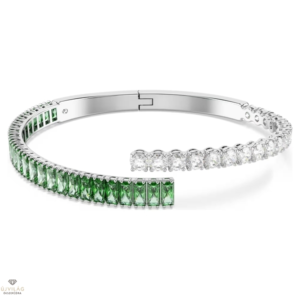 Színes, energikus és kifejező. Ez a Matrix karperec vidám kiegészítője lehet megjelenésének. Az önmagát keresztező karperec ródiumbevonatú, és kerek, valamint baguette metszésű, átlátszó és zöld Swarovski Zirconia kristályok díszítik. Egy vibráló darab, amely gyönyörűen illik a hozzáillő gyűrűhöz és fülbevalókhoz. Méretek: Hossz: 15.7 cm. Szélesség: 1.2 cm. Belső átmérő: 5.5 x 4.5 cm