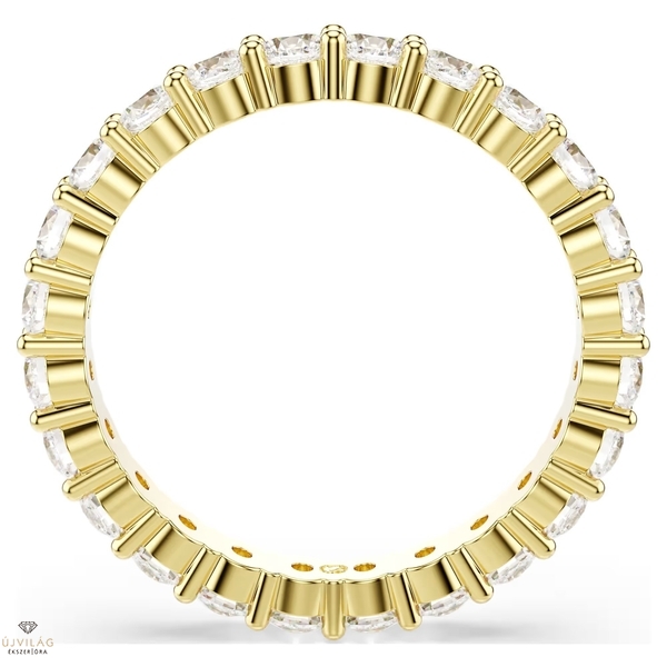 Ezt a végtelen ragyogást árasztó arany tónusú gyűrűt teljes felületén átlátszó Swarovski Zirconia kristályok díszítik. Azonnali ragyogást kölcsönöz bármilyen megjelenésnek, és a még látványosabb hatás kedvéért viselhet belőle kettőt vagy hármat is, vagy más stílusokkal kombinálva megalkothatja saját kedvenc összeállítását.