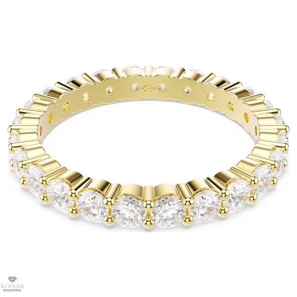 Ezt a végtelen ragyogást árasztó arany tónusú gyűrűt teljes felületén átlátszó Swarovski Zirconia kristályok díszítik. Azonnali ragyogást kölcsönöz bármilyen megjelenésnek, és a még látványosabb hatás kedvéért viselhet belőle kettőt vagy hármat is, vagy más stílusokkal kombinálva megalkothatja saját kedvenc összeállítását.