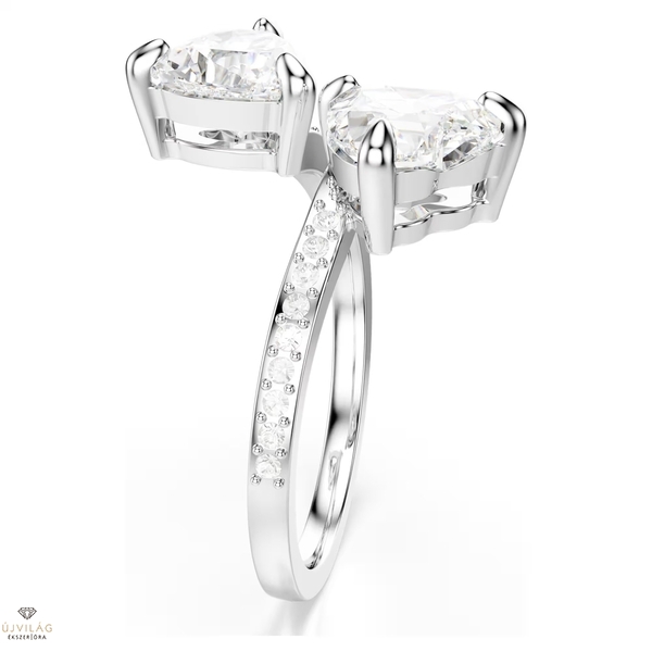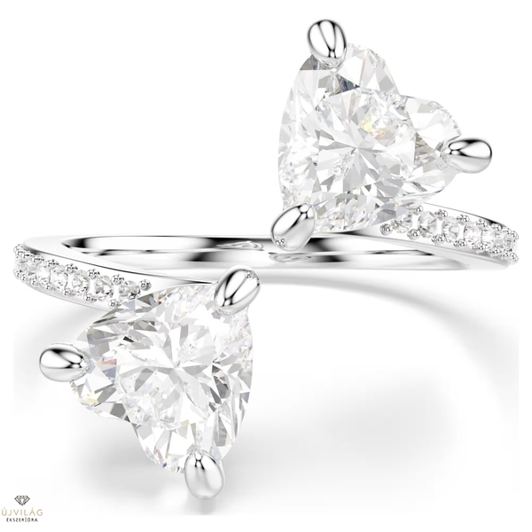 Az ezüstszínű bevonattal ellátott Swarovski gyűrűt két szív találkozása ihlette. A két szív alakú, gondosan megmunkált, középen találkozó kő a romantika szellemiségét foglalja magában. A szívek fehér ragyogását az egyszerű és elegáns formavilág csak még jobban kihangsúlyozza. A Swarovski gyűrű időtlen szimbolizmusa révén pompás ajándék lehet különleges szeretteink számára.