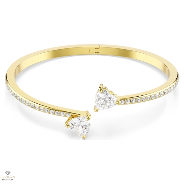 A művészi egyszerűség és egy csipetnyi romantika teszi ezt a Swarovski karperecet ideális ajándékká egy különleges személy számára. Az aranyszínű bevonattal ellátott kivitel rendkívül elegáns, és két, egymással összekapcsolódó szív alakú Swarovski Zirconia követ tartalmaz középső részként. Gyönyörű ajándék valakinek, akit imád. Méretek: Hossz: 16 cm. Szélesség: 1.8 cm. Belső átmérő: 5.6 x 4.6 cm