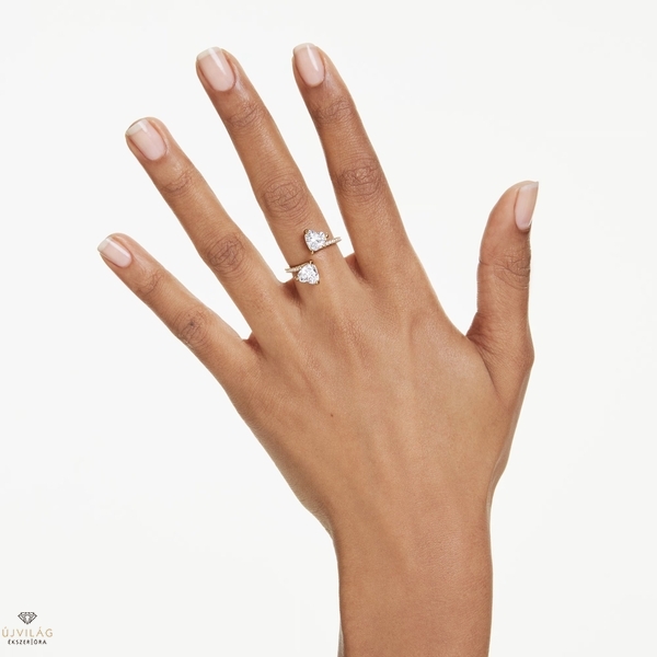 Ezt az aranyszínű bevonattal ellátott Swarovski gyűrűt két szív találkozásának gondolata ihlette. A romantika jegyében két, finoman metszett Swarovski Zirconia kő díszíti, amelyek középen találkoznak. A szívek ragyogását az egyszerű, mégis elegáns pavé pánt még jobban kiemeli, amely az ujj körül tekeredik. Az időtlen szimbolizmus teszi ezt a Swarovski gyűrűt tökéletes ajándékká a szeretett személynek.