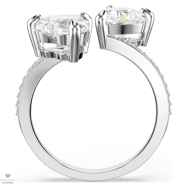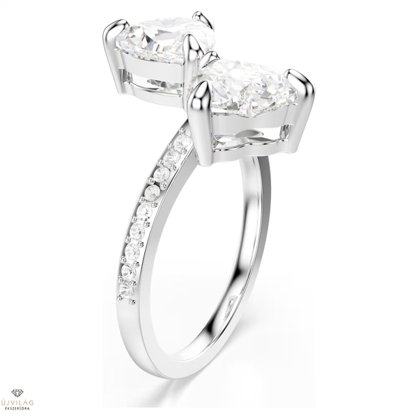 A ródium bevonatú Swarovski gyűrűt két szív találkozása ihlette. A két szív alakú, gondosan megmunkált, középen találkozó kő a romantika szellemiségét foglalja magában. A szívek fehér ragyogását az egyszerű és elegáns formavilág csak még jobban kihangsúlyozza. A Swarovski gyűrű időtlen szimbolizmusa révén pompás ajándék lehet különleges szeretteink számára.