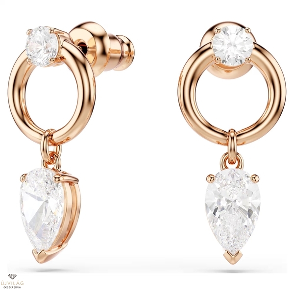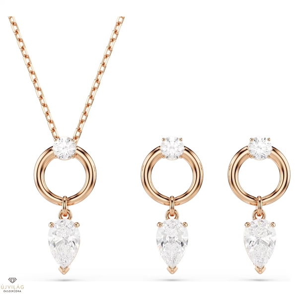 Adjon stílusának összehangolt, melegséget sugárzó megjelenést ezzel a medál és fülbevaló szettel. Mindegyik ragyogó motívum egy-egy körte metszésű Swarovski Zirconia követ tartalmaz, amely egy fényűző, rózsaaranyszínű bevonattal ellátott karikára van erősítve. Mindegyik darab közepén egy további kerek metszésű Swarovski Zirconia kő is található, míg a medálon a lánc csúsztatható zárszerkezete lehetővé teszi a könnyű hosszbeállítást. Méretek: Nyaklánc hossza: 38 - 45 cm. Minta mérete: 2.2 x 1 cm. Fülbevalók: 2.2 x 1 cm