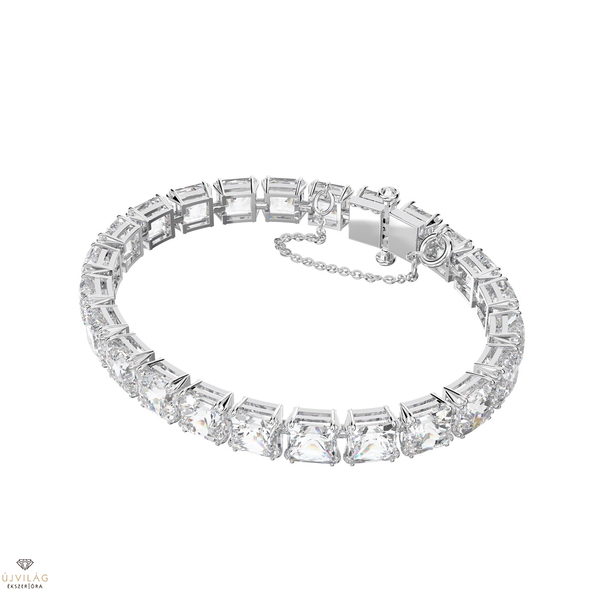 Ezt a zsanéros, elegáns kialakítású karkötőt négyszögmetszésű kristályok díszítik, amelyeket ródiumbevonatú karmos foglaltok tartanak, maga a karkötő pedig rejtett zárszerkezetű. A folytonosságot kifejező dizájnú és luxus kivitelezésű darabot önmagában is viselheti, új ruhatára alapdarabjaként, de felpróbálhatja a Millenia sorozat többi karkötőjével is, ha feltűnő, de modern hatást szeretne kelteni. A karkötő a Millenia ékszercsalád tagja, amelyet Giovanna Engelbert kreatív igazgató tervezett a Collection III számára. Zárás és kinyitás: csúsztassa a kampókat a megfelelő lyukakba az utolsó kő alján, majd nyomja meg, hogy a helyükre kattanjanak. Rögzítse a biztonsági láncot a kis karos csattal. A nyitáshoz oldja ki a biztonsági láncot, és egyszerre nyomja meg a kő két oldalán lévő gombokat a kampók kioldásához. Minimális hossz: 17 cm, Maximális hossz: 19 cm, Szélesség: 0.7 cm