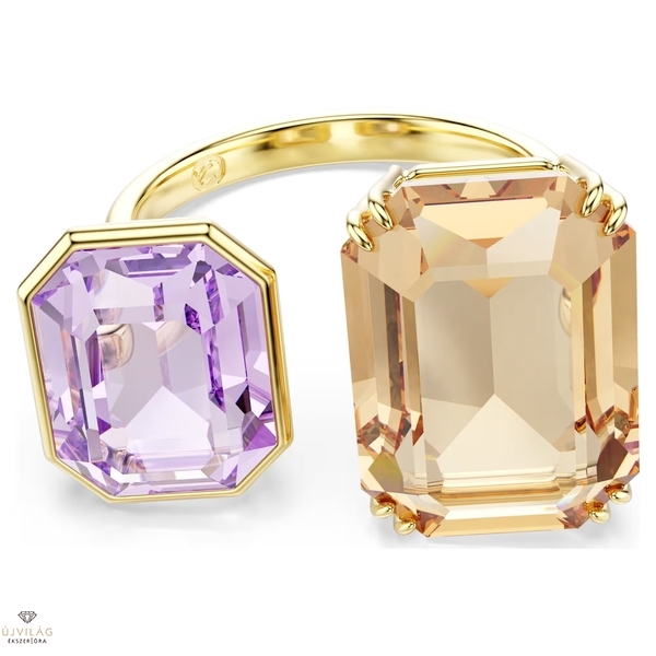 Ez az aszimmetrikus koktélgyűrű biztosan az ékszerkollekciója új kedvence lesz. A nyitott, aranyszínű bevonattal ellátott gyűrű egyik oldalán egy bezel foglalatú lila kristályt, a másikon pedig egy karamellszínű kristályt visel dupla prong foglalatban. Viselje önmagában, vagy a Millenia család más gyűrűivel kombinálva a modern elegancia hibátlan megtestesítőjeként.