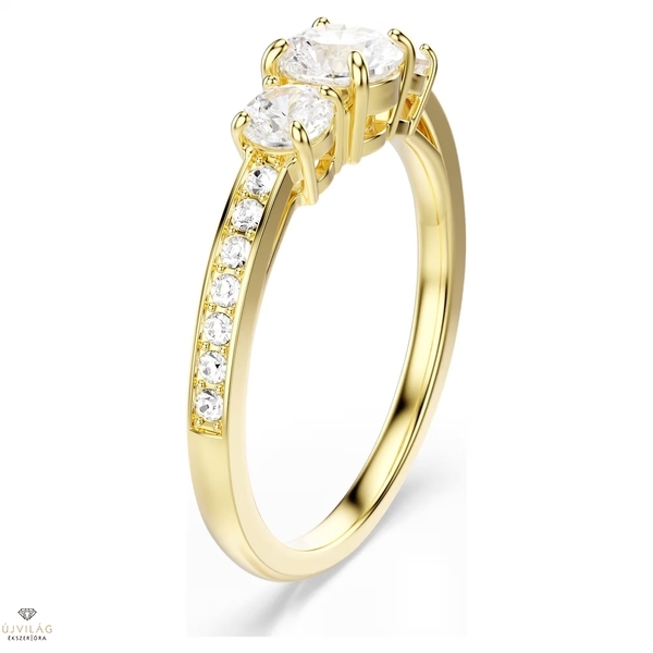 A Stilla ékszercsalád minden alkalomra tökéletes, letisztult eleganciát sugárzó darabokat kínál. Ez a klasszikus gyűrű új szintre emeli a ragyogást a szár mentén elhelyezett átlátszó kristályokkal és a három precíziós metszésű Swarovski Zirconia kővel, amelyeket ragyogó, aranytónusú bevonat egészít ki. Egy gyönyörű ékszer a mindennapokra, amely könnyedén kombinálható az ékszercsalád többi darabjával.
