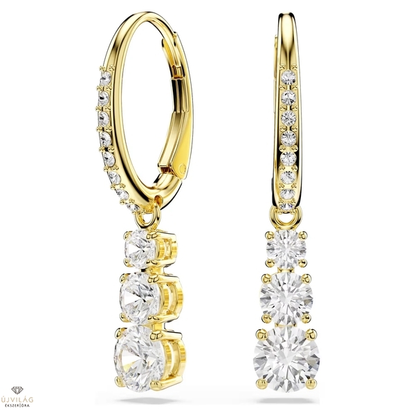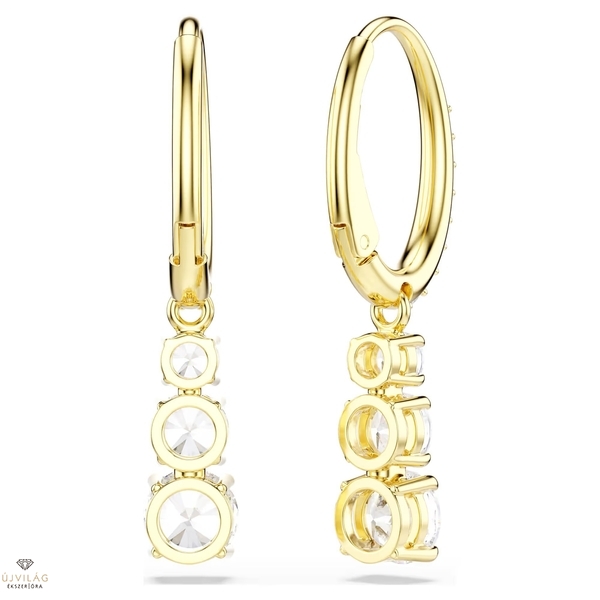 Ezek a lenyűgöző bedugós fülbevalók az örök romantika jegyében készültek. Mindegyik darabot három átlátszó Swarovski Zirconia kristály díszít aranytónusú foglalatban, a karikákon pedig csillogó pavé díszítés látható. Időtlen eleganciájuknak köszönhetően megbecsült emléktárggyá válnak. A hozzáillő nyaklánccal vagy gyűrűvel kombinálva fokozható a hatás. Méretek: 2.7 x 0.5 cm