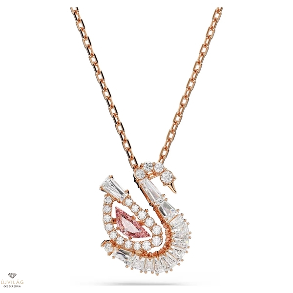 Ez a medál a Swarovski ikonikus hattyújának finom mozgását jeleníti meg. A rózsaarany-tónusú bevonattal ellátott láncon függő központi motívum elegáns sziluettet ad, amelyet átlátszó Swarovski Zirconia kristályok és egy hattyútest formájú, rózsaszín mozgóköves kristály díszít. Ez a ragyogó részlet a színek és a fény végtelen mozgását kelti életre, és minden pillanatban csillogóvá varázsolja stílusát. Méretek: Hossz: 38 cm. Minta mérete: 1.7 x 1.4 cm