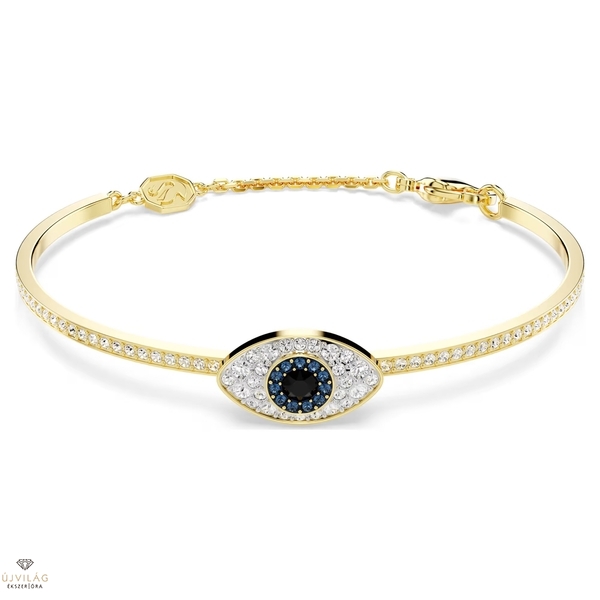 Ez a Symbolica karperec pozitív kisugárzást kölcsönöz. Az aranyszínű bevonattal készült ékszer pavé berakásos szárának közepén a gonosz szem átlátszó, kék és fekete kristálypavéval díszített, domború motívuma kapott helyet. A lazább zárszerkezet könnyű és kényelmes viseletet biztosít. Ez a darab minden nap megidézi a pozitív energiákat. Hossz: 18 cm. Belső átmérő: 6.1 x 4.2 cm. Minta mérete: 0.9 x 1.5 cm.