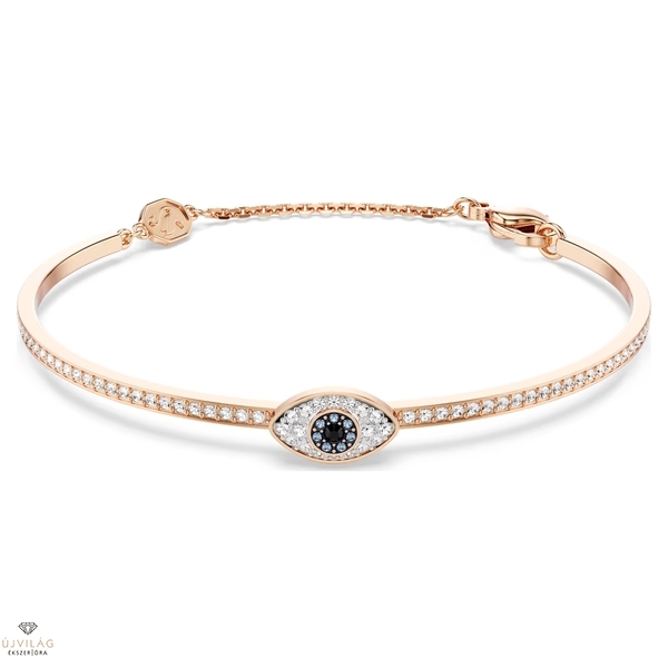 Öltözzön pozitív energiába ezzel a Symbolica karpereccel. A rózsaarany tónusú bevonattal ellátott ékszer pavé díszítésű pánttal rendelkezik, melynek közepén egy domború, gonosz szemet ábrázoló motívum található, átlátszó, kék és fekete pavékristályokkal díszítve. A tömör pánt állítható lánccal van ellátva a kényelmes és személyre szabott illeszkedés érdekében. Viselje ezt a darabot, hogy mindennap jó energiák vegyék körül. Hossz: 15.5 cm. Belső átmérő: 5.5 x 3.6 cm. Minta mérete: 0.7 x 1.1 cm. Nyitott rész szélessége: 4.7 cm.