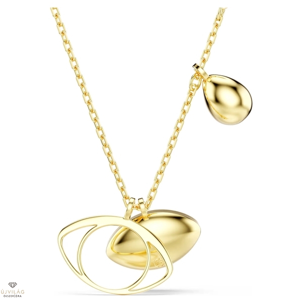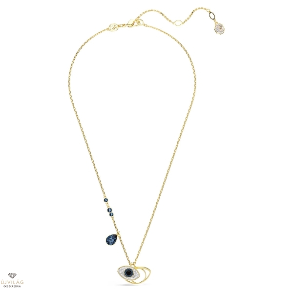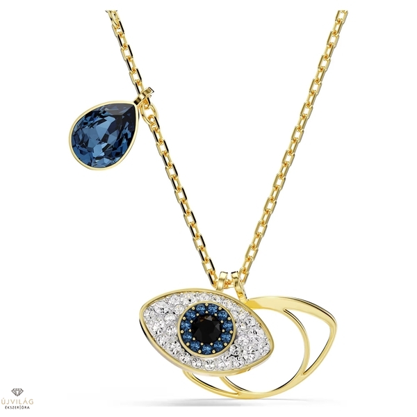 A titokzatos Symbolica medál stílusos védelmet kínál. A gonosz szem kettős motívuma egy kék, fekete és átlátszó pavé kristályos berakással készült, domború kialakítású formában jelenik meg, amelyet egy aranyszínű bevonatú fémváltozat egészíti ki. A gyöngyös láncot emellett kerek és körte alakú metszéssel készült, sötétkék kristályok is díszítik. Ez az ékszer magabiztosságot kölcsönöz a mindennapokban. Hossz (minimum - maximum): 38 - 45 cm. Minta mérete: 1.8 x 1.5 cm.