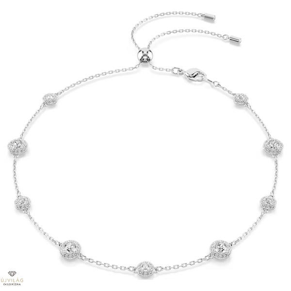 Ez az innovatív ékszer nyakláncként vagy choker nyakláncként is viselhető, így sokoldalú választás a mindennapi viselethez. A ródiumbevonatú lánc csúsztatható zárszerkezettel rendelkezik a könnyen állítható illeszkedés érdekében, és csillogó, kétoldalas motívumok díszítik. Egyszerűen fordítsa meg a nyakláncot a kerek metszésű kristályok más-más megjelenítéséhez. Kombinálja más Una Angelic darabokkal a tökéletes ragyogás érdekében. Méretek: Hossz (minimum - maximum): 30 - 44 cm. Minta mérete: 0.6 x 0.8 cm