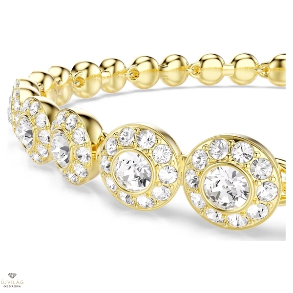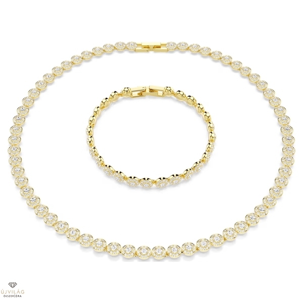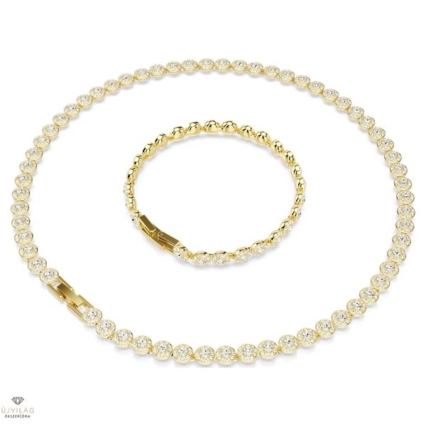 A luxust az egész stílusodban harmonizáló, aranyszínű bevonattal készült szett arra született, hogy ragyogjon. Minden darabot teljes egészében kerek metszésű kristályok díszítenek, amelyeket átlátszó pavé kristályokból álló glória övez. Ez a finom minta a nyakláncon és a karkötőn is visszaköszön. A ráhajtható csatnak köszönhetően az ékszerek észrevétlenül simulnak a bőrhöz, a hosszabbítók pedig lehetővé teszik a méret és a kényelem szerinti beállítást. Viseld együtt a szett darabjait, ha igazán káprázatos megjelenésre vágysz. Nyaklánc hossza: 38 - 40 cm. Karkötő hossza: 16.5 - 19 cm. Szélesség: 0.6 cm.