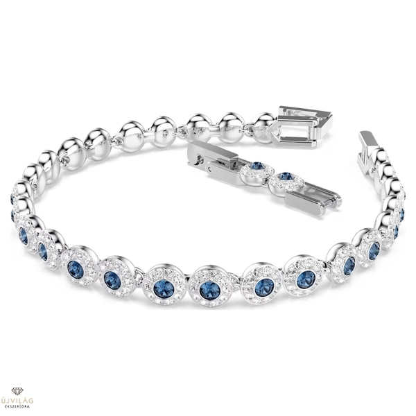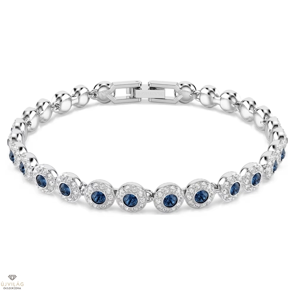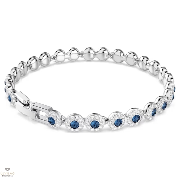 Készüljön fel a ragyogásra az Una Angelic ékszercsalád vonzó teniszkarkötőjével. Az állítható hosszabbítóval ellátott, ródiumbevonatú ékszert egy sor kerek metszésű, élénk kék kristály alkotja, amelyet csillogó pavé egészít ki. Viselje a hozzáillő nyaklánccal, és minden tekintet Önre szegeződik majd. Méretek: Hossz (minimum - maximum): 16.5 - 19 cm. Szélesség: 0.6 cm