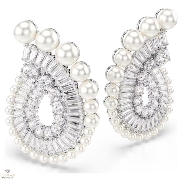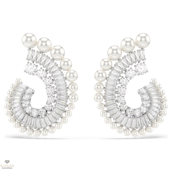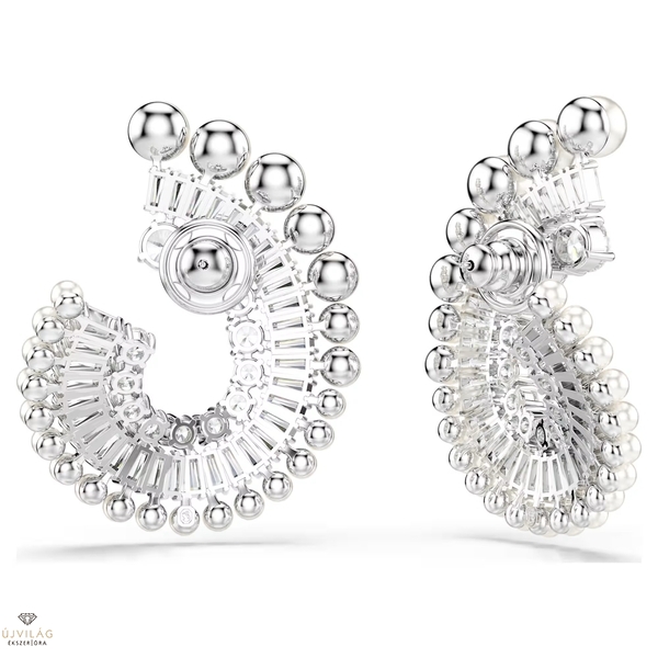 Ezzel a Swarovski savoir-faire-jét dicsérő, lenyűgöző bedugós fülbevalóval bármilyen öltözéket ultramodernné tehet. A ródiumbevonatú ékszeren nyitott spirál formában helyezkednek el a kör- és baguette metszésű, különféle méretű Swarovski Zirconia kövek. A külső részen méret szerint elrendezett Swarovski-kristálygyöngyök sorakoznak, fényűző hatást és magával ragadó megjelenést kölcsönözve az ékszernek. Ez a ragyogó és gyönyörű fülbevaló könnyedén kombinálható az ékszercsalád más darabjaival. Méret: 4.2 x 3.2 cm.