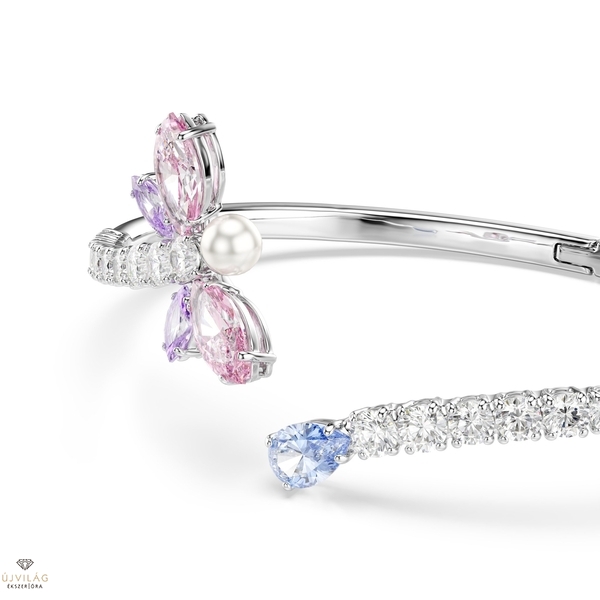 Ebben a természet ihlette karkötőben a színek és a varázslat találkozik. A tiszta Swarovski cirkóniákkal kirakott, nyitott karkötő egyik végén egy kék, csepp alakú Swarovski cirkónia, a másik végén pedig egy szitakötő motívum található, amelyet rózsaszín és lila szárnyak, valamint egy Swarovski kristálygyöngy alkotnak. Ez a színes karkötő ródiumbevonatú, csuklós záródással rendelkezik, és a szitakötő-sorozat többi, hozzá illő darabjával együtt is viselhető.