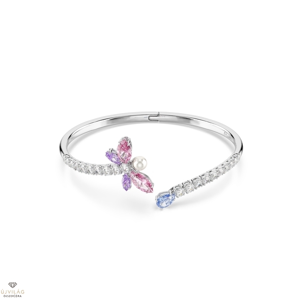 Ebben a természet ihlette karkötőben a színek és a varázslat találkozik. A tiszta Swarovski cirkóniákkal kirakott, nyitott karkötő egyik végén egy kék, csepp alakú Swarovski cirkónia, a másik végén pedig egy szitakötő motívum található, amelyet rózsaszín és lila szárnyak, valamint egy Swarovski kristálygyöngy alkotnak. Ez a színes karkötő ródiumbevonatú, csuklós záródással rendelkezik, és a szitakötő-sorozat többi, hozzá illő darabjával együtt is viselhető.