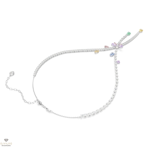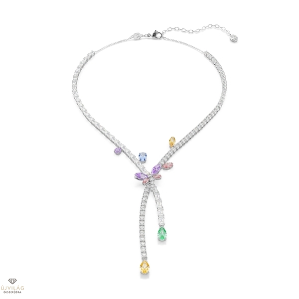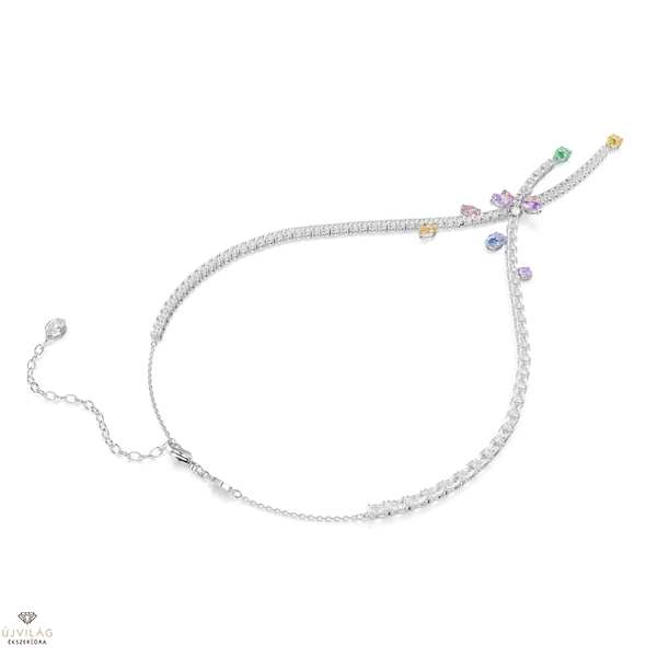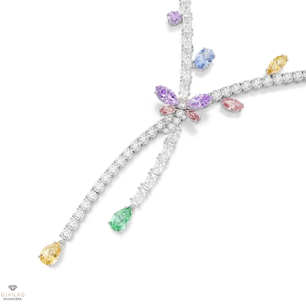 Képzelőerővel és izgalommal megalkotott, ez a crossover nyaklánc tele van meglepetésekkel. A ródiummal bevont láncra kerek és baguette vágású, tiszta Swarovski cirkóniák vannak felszerelve, míg a különféle pasztellszínű Swarovski cirkóniák kreativitással töltik meg az ékszert. Középen egy rózsaszín és lila színű szitakötő motívum ad a nyakláncnak egy csipetnyi átalakuló erőt.