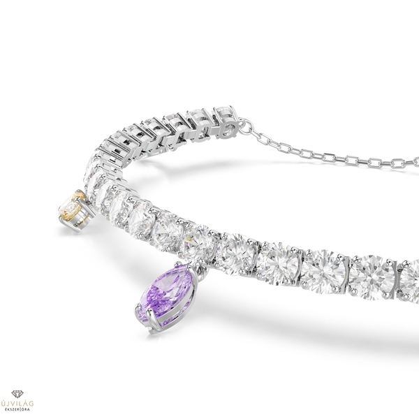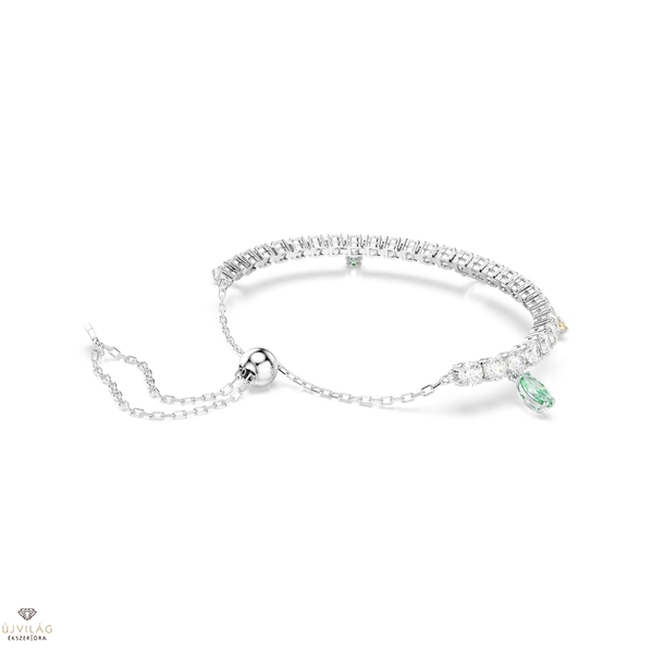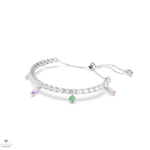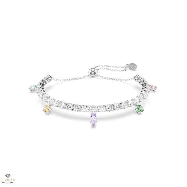 Ragyogj egész nap ennek a fényvisszaverő Swarovski karkötőnek az örömével! A ródiummal bevont karkötőn egyenletes sorban helyezkednek el a tiszta Swarovski Zirconia kövek, alattuk pedig különböző pasztell színű, vegyes csiszolású kövek lógnak. Ébreszd fel stílusod kreativitását ezzel az ékszerrel, és viseld az ugyanabból a kollekcióból származó, hozzá illő nyaklánccal együtt!