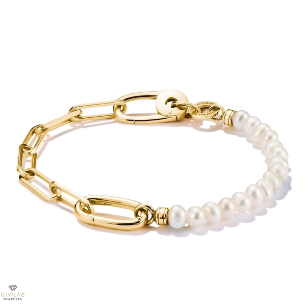 Tökéletes statement stílusokhoz és személyre szabott ékszerkreációkhoz: ez a charm karkötő rendkívüli dizájnt mutat be. Az egyik fele elegáns 18k-s aranyozással ellátott, újrahasznosított 925-ös ezüstből készült, gemkapocsszerű láncszemekből készült, míg a másik fele ragyogó édesvízi tenyésztett gyöngyökkel van díszítve. Egy nagyobb, ovális középső darab - a Connect Link - harmonikusan összeköti a két felet, és kinyitható, hogy könnyen fel lehessen csatolni a hurkokkal ellátott charmokat. A kreatív, stílusos és tartalmas ékszerkombinációkhoz adjon további charmokat karabineres csatokkal a gemkapocs-szerű láncszemekhez. Méretek: Magasság: kb. 8,50 mm; Szélesség: kb. 16,50 mm; Vastagság: kb. 4,50 mm.
