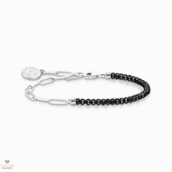 A charm karkötő izgalmas esztétikával varázsol el. Magas minőségű 925-ös sterling ezüstből készült, hosszú horgonyláncok által inspirált láncszemes karkötőből és egy ónixból készült gyöngyös karkötőből áll. A köves karkötő végződéseit részletesen vésett vonalak díszítik. A karkötő végét egy kerek THOMAS SABO Charm Club érme díszíti, ami kézzel festett, csillogó, fehér hideg zománc. A karkötő egyénileg kombinálható különböző charm medálokkal. 13, 15, 17 és 19 cm hosszúságban kapható.
