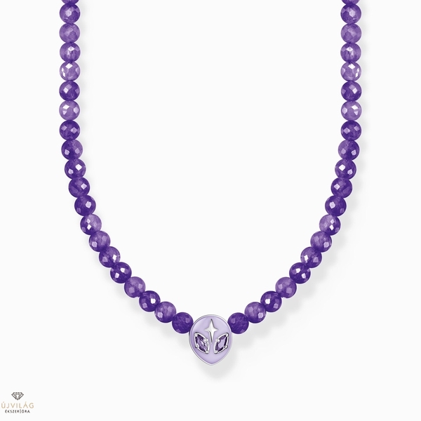 A háromdimenziós földönkívüli fej az abszolút középpontja ennek az ametisztutánzatból készült gyöngyös nyakláncnak. Az idegen fejet a sötétben szikrázó lila hidegzománc borítja. Az idegenek homlokát csillag díszíti, míg a szemük ametiszt színű, marquise csiszolású cirkónia kövekből áll. A gyöngyös nyaklánchoz kiváló minőségű 925-ös sterling ezüstből készült hosszabbító lánc tartozik. A lánc 34 és 42 cm közötti hosszúságra állítható, valamint más nyakláncokkal is kombinálható. Méret: Magasság kb. 9,00 mm, Szélesség kb. 10,00 mm, Vastagság kb. 2,50 mm