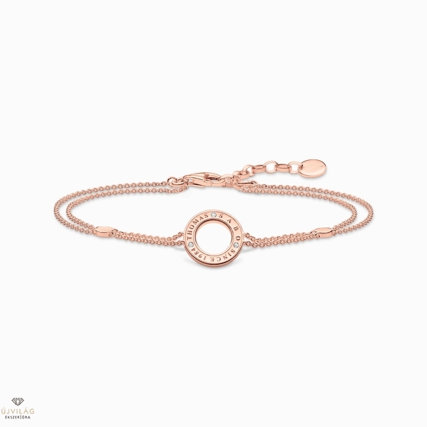 Kétsoros női karkötő kiváló minőségű 925 sterling ezüstből, értékes rózsa arany bevonattal Kör medál THOMAS SABO gravírozással és kézzel beállított cirkónia kövekkel, fehér színben Hossza állítható 16-19 cm között Kerek tökéletesség: a 925 sterling ezüstből készült finom, kétsoros karkötő kiváló minőségű rózsa arany bevonattal van kidolgozva. A fénypont a kör medál THOMAS SABO gravírozással és kézzel beállított cirkónia kövekkel, fehér színben. Két kerek elem teszi teljessé ezt az időtlenül egyszerű ékszert. A karkötő hossza 16-19 cm között állítható, hogy illeszkedjen a csuklóhoz a hosszabbító láncnak köszönhetően. Kiváló ötlet ajándéknak egy különleges alkalomra. Magasság kb. 12,00 mm, Szélesség kb. 12,00 mm, Vastagság kb. 1,00 mm